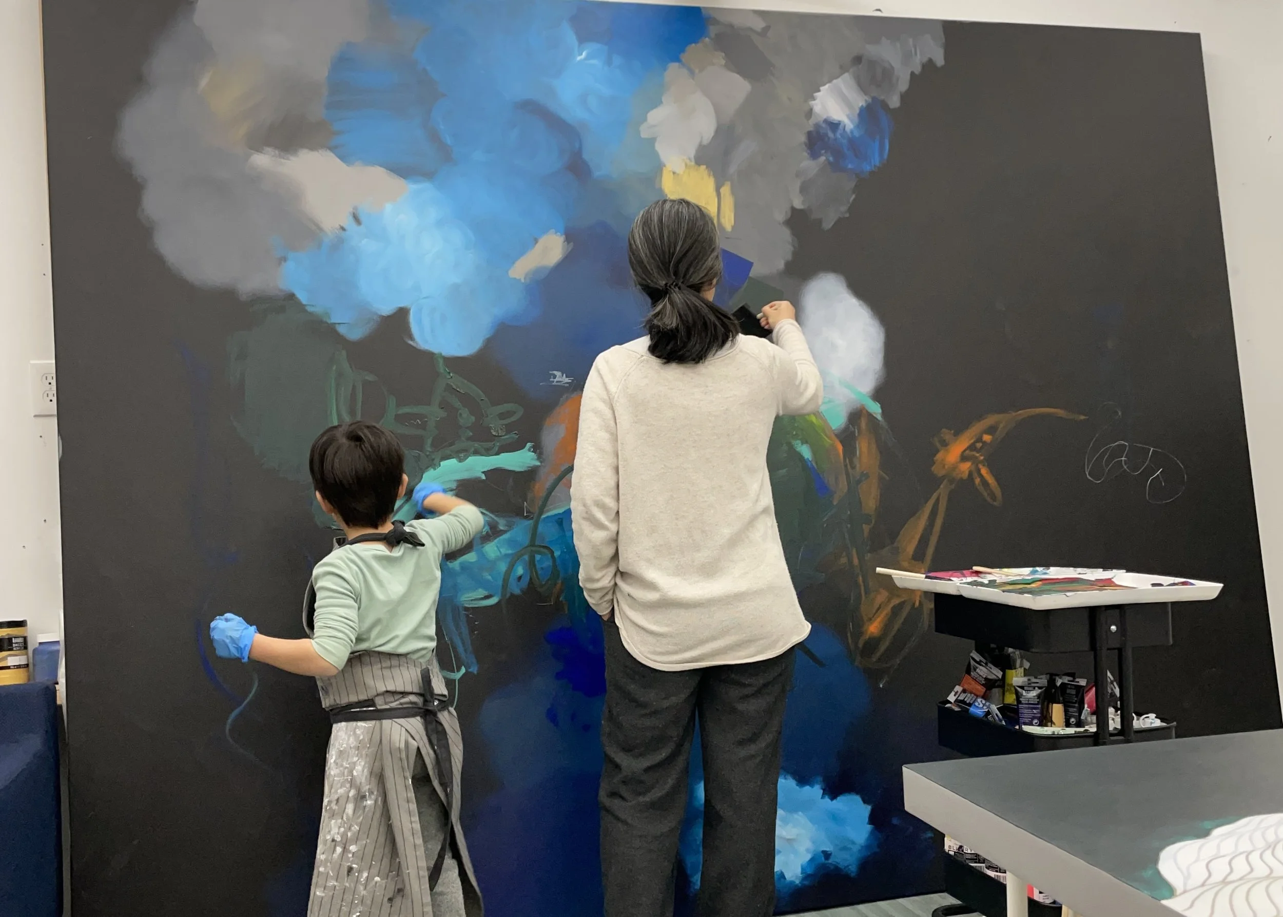 3 years ago my oldest walked into studio asking to paint. I had a 7x9ft canvas that I wasn’t ready to tackle so I said sure, let’s start here. For a bit of time we were lost in his world of color and blobs and no sense of mistakes. Every few months over the next 2 years he’d come in and repeat the process. Never afraid. Always ready.